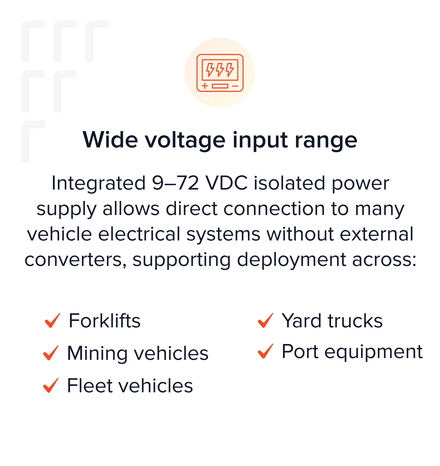 Integrated 9–72 VDC isolated power supply allows direct connection to many vehicle electrical systems without external converters, supporting deployment across: